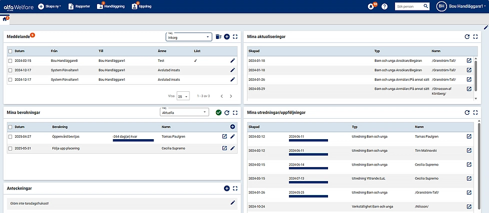 Startsidan ger en snabb och tydlig överblick av pågående ärenden samt inkomna meddelanden, aviseringar och bevakningar.