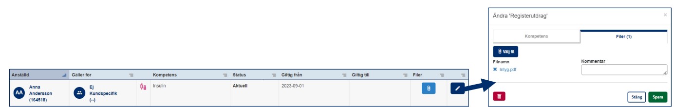 Har ni rättighet kan ni även se filer kopplat till kompetenser samt redigera den på pennan.