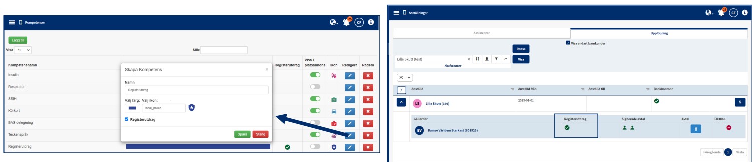I Admin/Register/Kompetenser kan ni ställa in vilken kompetens som ska flaggas som registerutdrag. Här ställer man också in vilka kompetenser som ska visas ut i Ansökningar (Visa i platsannons). Om en assistent har kompetensen inlagd i sitt assistentkort inom en giltig period så kan ni i Anställningar följa upp vilka assistenter som har registerutdrag i fliken uppföljning. Lägger ni in kompetensen som en allmän kompetens så visas den i uppföljningssidan kopplat till alla kunder. Det är även inställt att om du lägger in registerutdraget som en kundspecifik kompetens så visas den som grön hos alla kunder då registerutdraget inte är kopplat till kund. I grunden får endast personen som ligger som chef på assistentkortet se filen som är uppladdad kopplat till en kompetens som är klassad som registerutdrag. Med rättigheten Får se registerutdrag i kompetenser får även en person som inte ligger som chef över assistenten se filen.