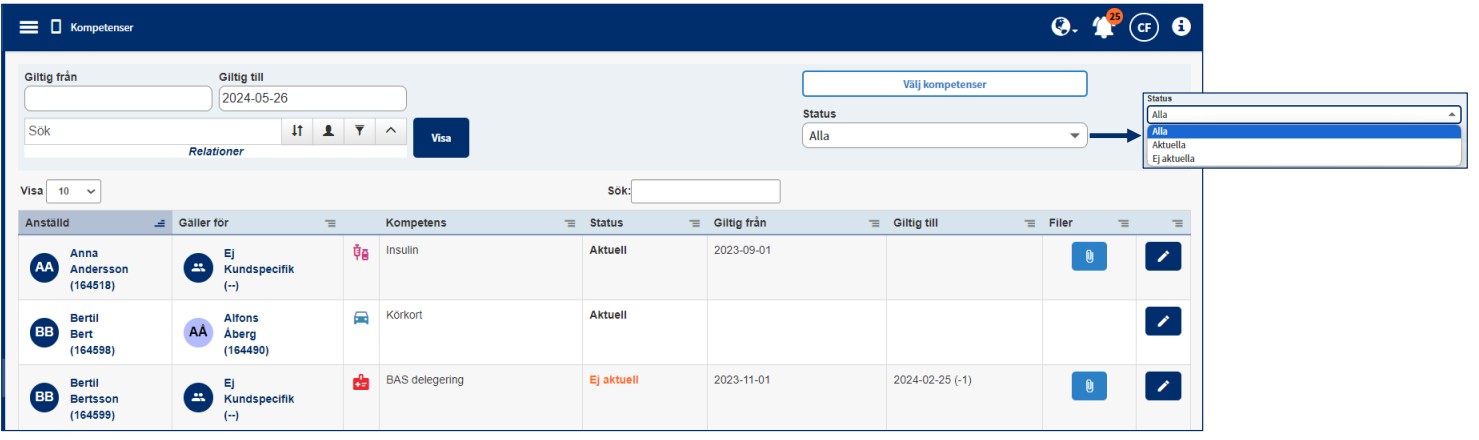 I detta menyvalet kan ni filtrera fram resultat per kompetens, ni kan också följa upp aktuella samt ej aktuella kompetenser för alla assistenter ni har behörighet att