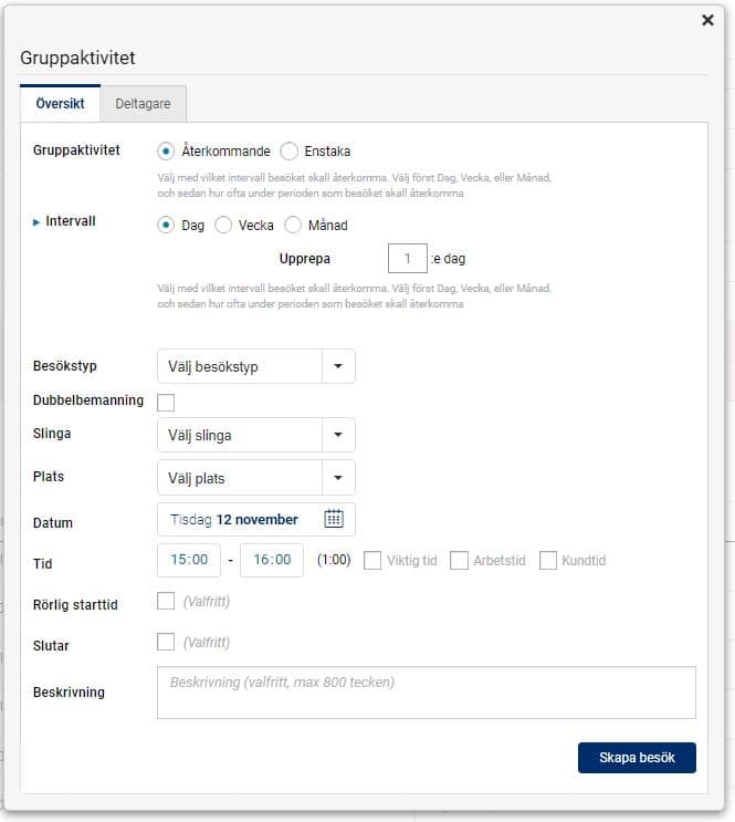 Det första steget är att välja om aktiviteten ska vara återkommande (och i så fall med vilket intervall) eller enstaka. Därefter ska man ange vilken besökstyp som är aktuell för aktiviteten, här går det att antingen välja bland de som redan eller skapa en egen som passar ändamålet.