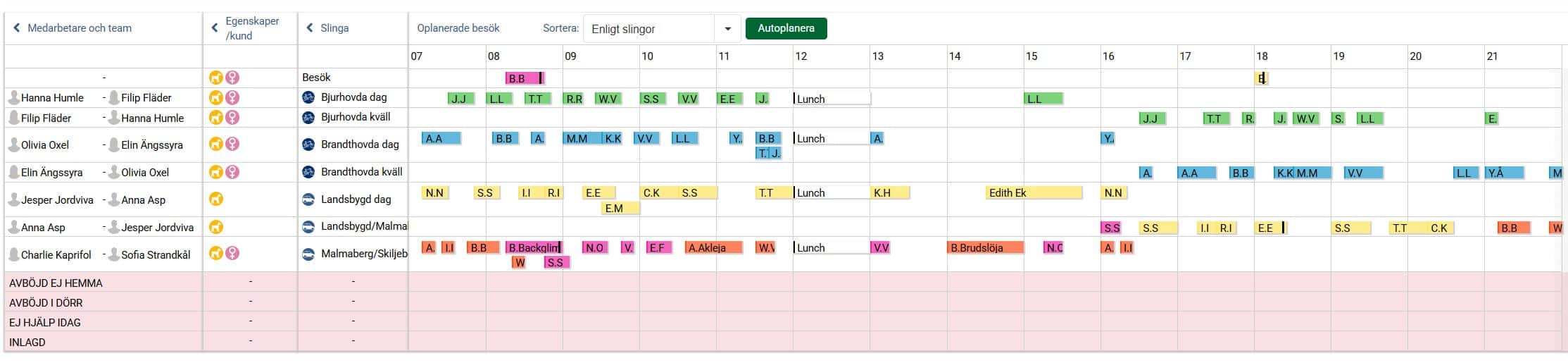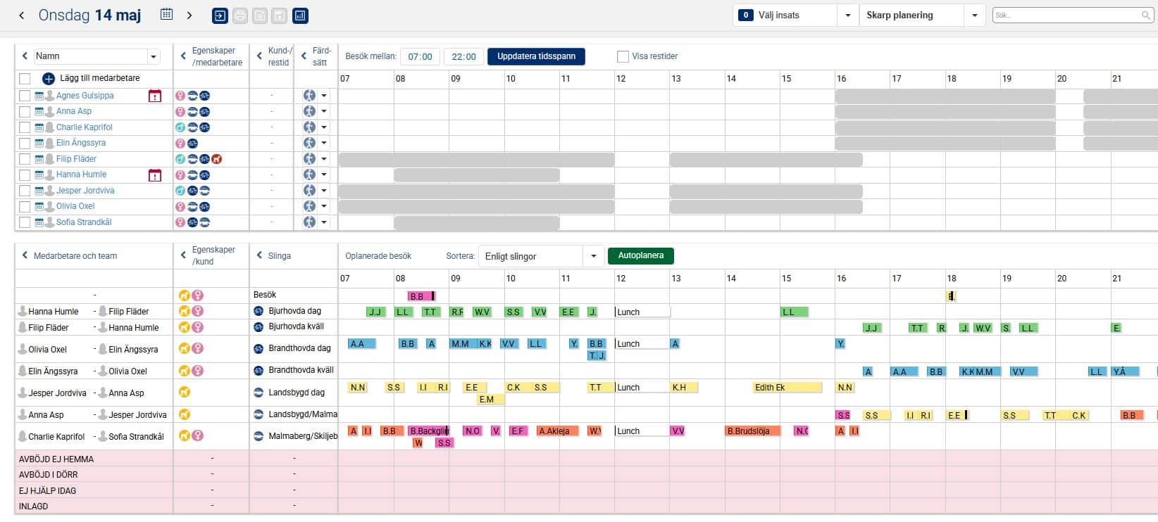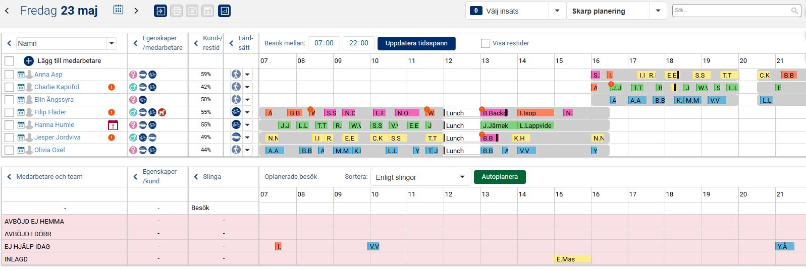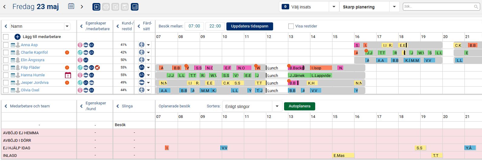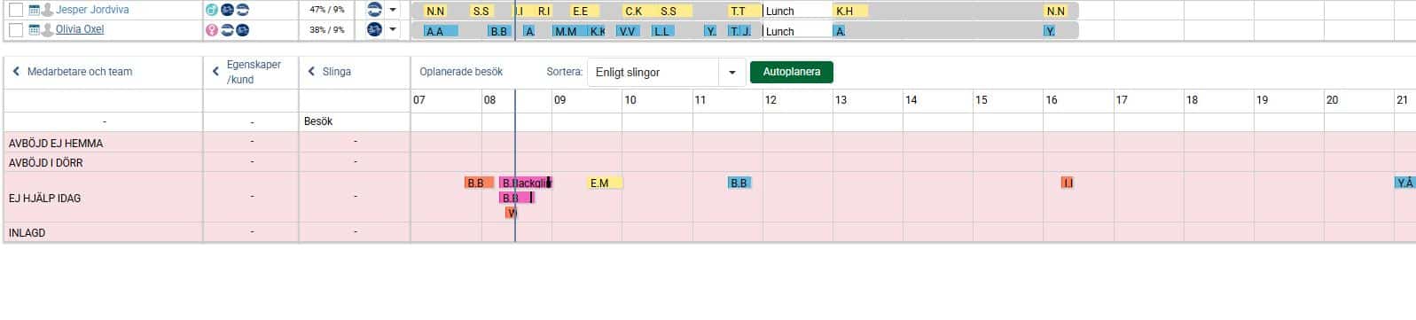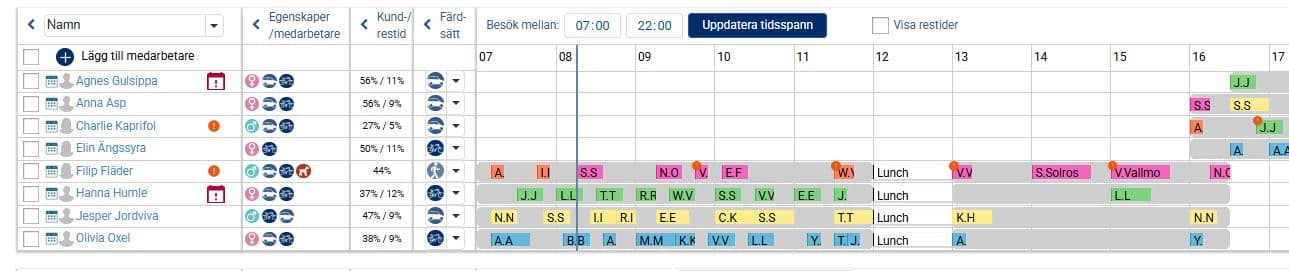 När vi nu i exemplet nedan har planerat ut samtliga besök och aktiviteter under valt tidsspann för aktuell dag ligger besöken och aktiviteterna planerade på medarbetare utifrån grundplaneringen, det vill säga i den ordning de låg i slingan. Man kan nu ha behov av att göra några mindre justeringar så att det passar förutsättningarna för den aktuella dagen. Det kan exempelvis handla om att flytta besök och aktiviteter i tid så att de inte överlappar varandra, och även att flytta besök och aktiviteter till annan medarbetare om det kanske är en medarbetare som har lite väl många till skillnad från en annan.