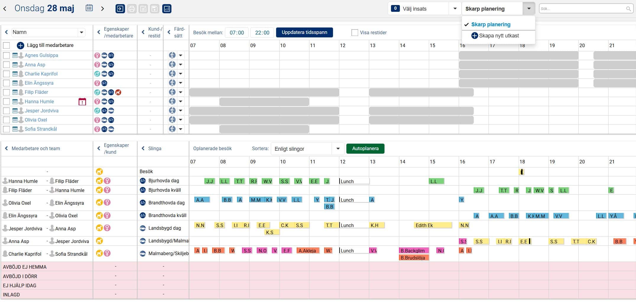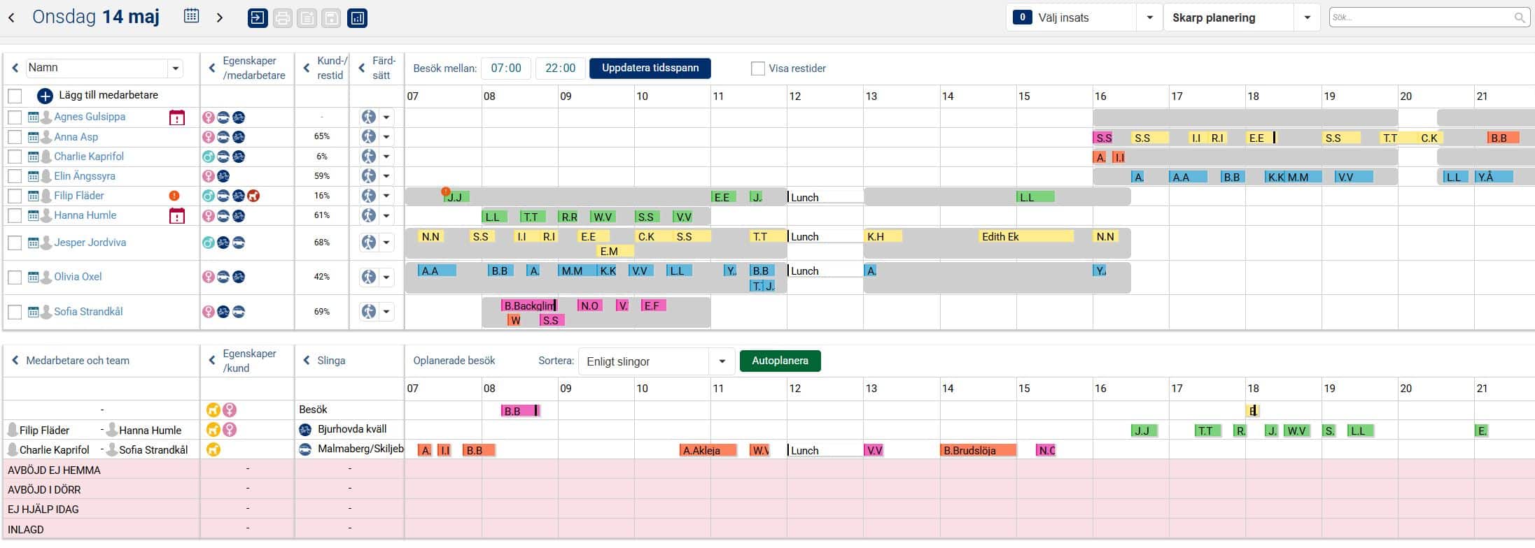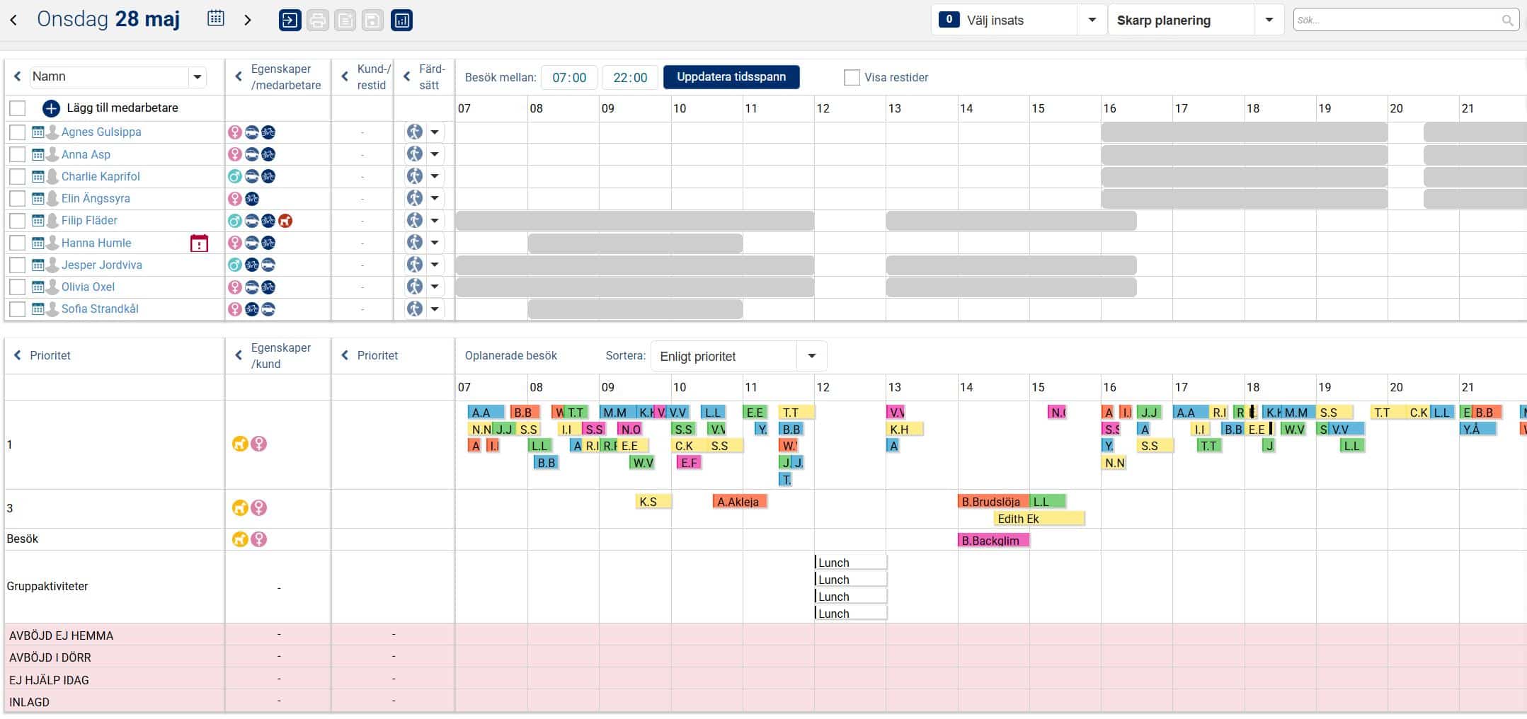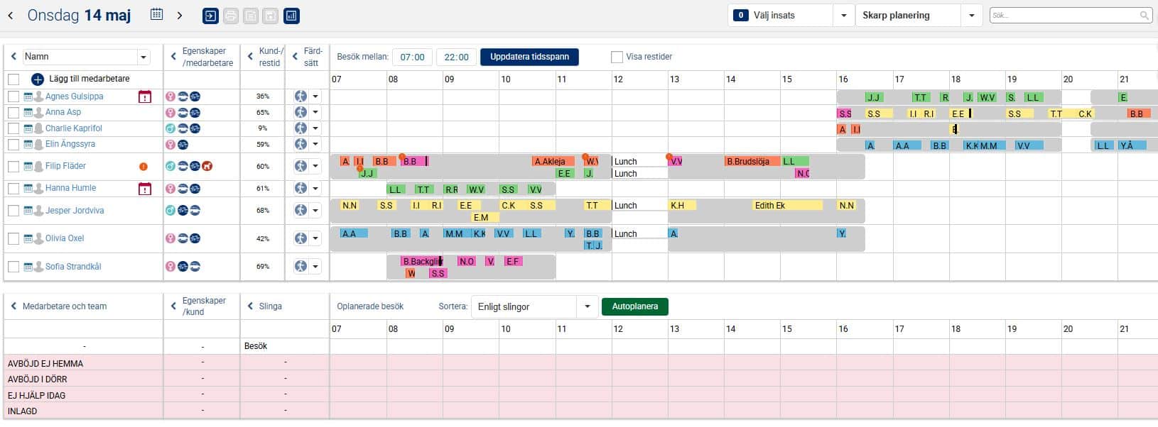När vi nu i exemplet nedan har planerat ut samtliga besök och aktiviteter under valt tidsspann för aktuell dag ligger besöken och aktiviteterna planerade på medarbetare utifrån grundplaneringen, det vill säga i den ordning de låg i slingan. Man kan nu ha behov av att göra några mindre justeringar så att det passar förutsättningarna för den aktuella dagen. Det kan exempelvis handla om att flytta besök och aktiviteter i tid så att de inte överlappar varandra, och även att flytta besök och aktiviteter till annan medarbetare om det kanske är en medarbetare som har lite väl många till skillnad från en annan.