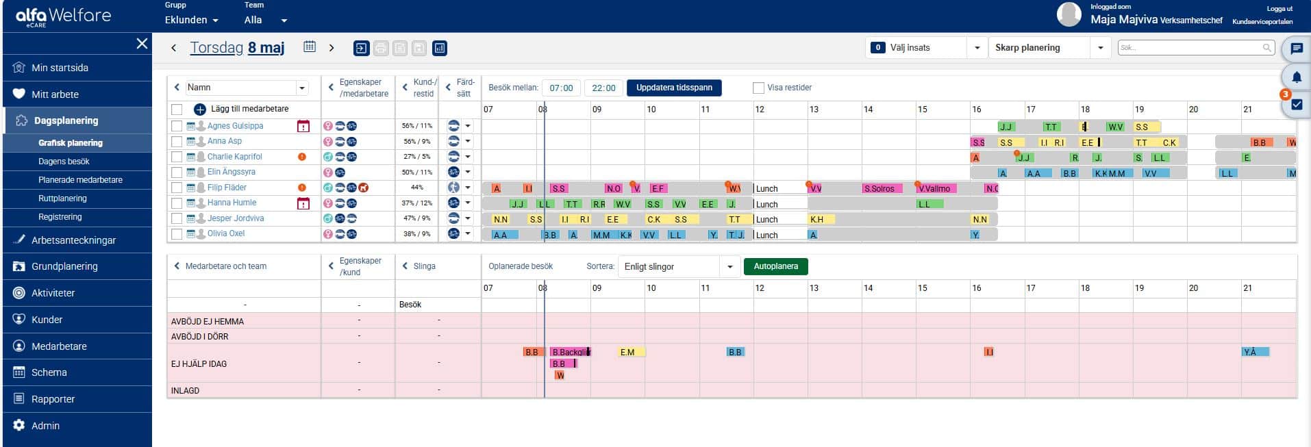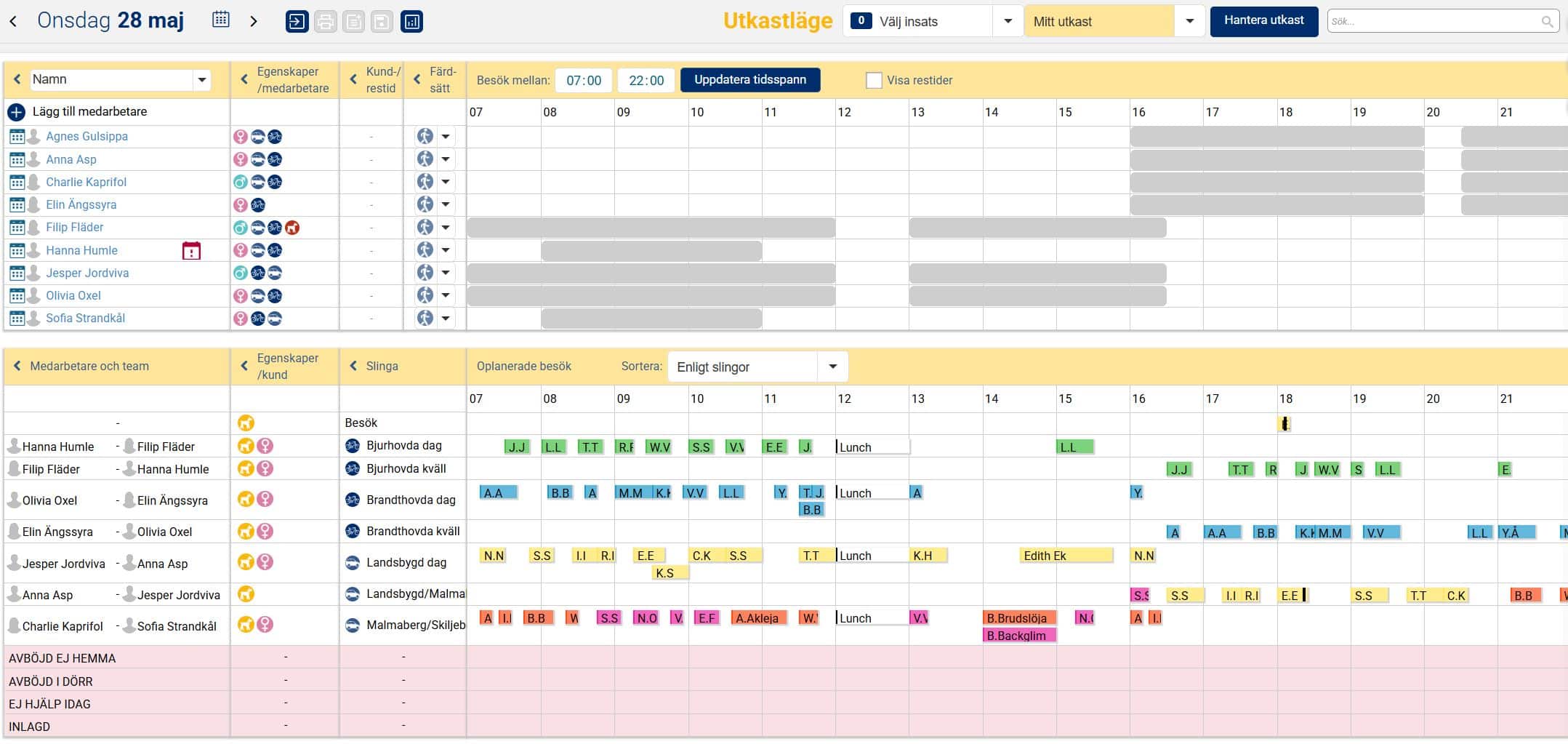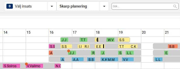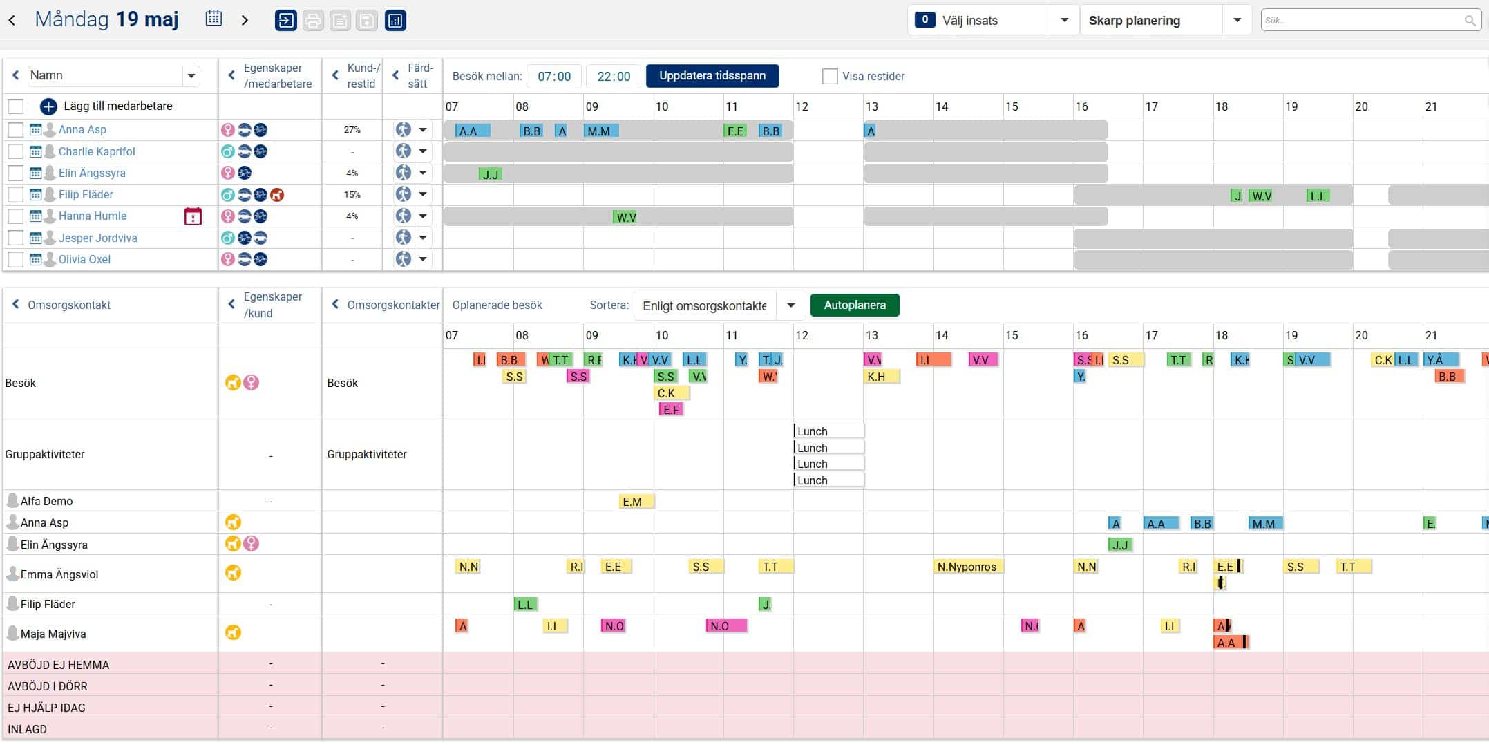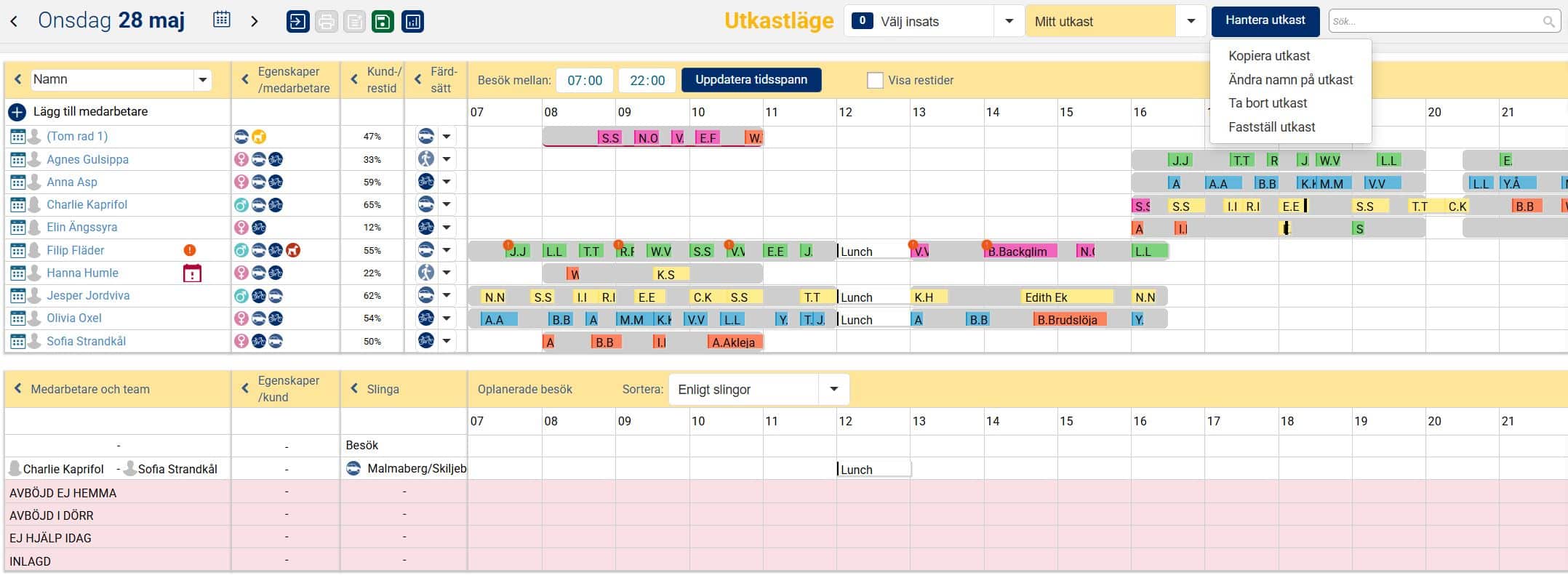 När vi nu i exemplet nedan har planerat ut samtliga besök och aktiviteter under valt tidsspann för aktuell dag ligger besöken och aktiviteterna planerade på medarbetare utifrån grundplaneringen, det vill säga i den ordning de låg i slingan. Man kan nu ha behov av att göra några mindre justeringar så att det passar förutsättningarna för den aktuella dagen. Det kan exempelvis handla om att flytta besök och aktiviteter i tid så att de inte överlappar varandra, och även att flytta besök och aktiviteter till annan medarbetare om det kanske är en medarbetare som har lite väl många till skillnad från en annan.