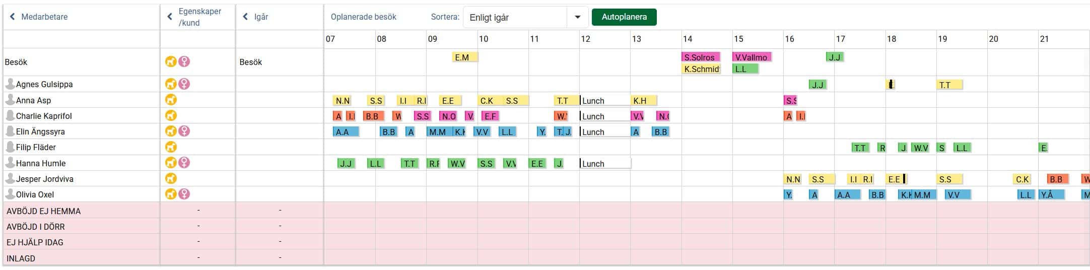 Första steget är att man väljer Sortera: Enligt igår i rullistan bredvid autoplanera-knappen. Samtliga besök och aktiviteter sorteras då utifrån hur de var utplanerade föregående dag och det framgår också vilka medarbetare som var planerade att utföra besöken och aktiviteterna. Om det på den aktuella dagen finns besök och aktiviteter som inte förekom föregående dag hamnar de på raden Besök.