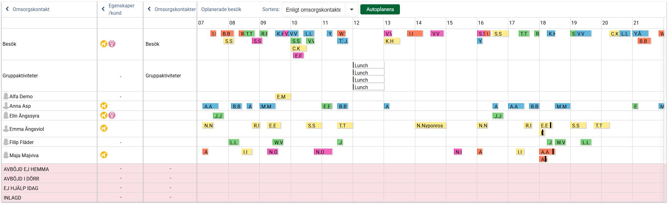 Första steget är att man väljer Sortera: Enligt omsorgskontakter i rullistan bredvid autoplanera-knappen. Samtliga besök och aktiviteter sorteras då utifrån omsorgskontakt. Som vi kan se i exemplet nedan hamnar gruppaktiviteterna på en separat rad och de besök och aktiviteter som hör till kunder som saknar omsorgskontakt hamnar på raden Besök.
