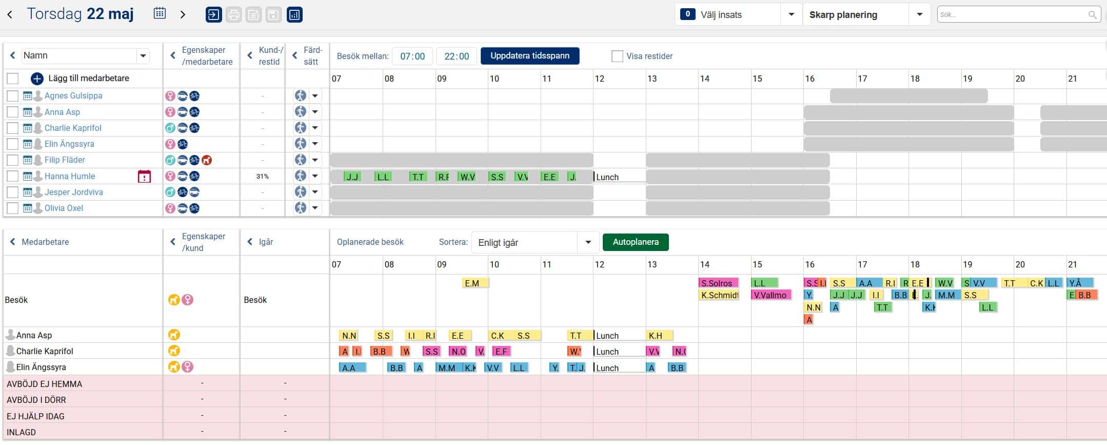 Nästa steg är att klicka på Autoplanera-knappen för att se vilka besök och aktiviteter som kan planeras ut automatiskt av systemet. I exemplet nedan kan vi se att det endast var några besök som kunde planeras ut automatiskt. Detta har dels att göra med att medarbetarna Anna, Charlie och Elin inte arbetar idag (de besök som var planerade på dom under gårdagen kan därmed inte planeras ut), och dels att vi har flera besök som inte fanns i gårdagens planering som därmed inte heller kan planeras ut.