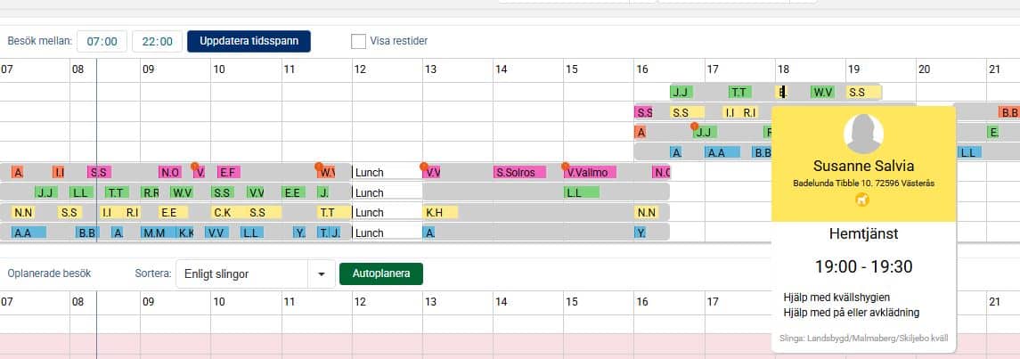 I den del av Grafiska planeringen där vi ser medarbetarnas arbetspass som gråa fält ser vi också färgglada block. Detta är kundernas besök och aktiviteter för aktuell dag som är planerade på medarbetare. För att se mer information om ett besök eller en aktivitet kan man hålla muspekaren över det och får då upp en ruta med mer information, se exempel nedan för besöket hos kunden Susanne Salvia. Ovanför de planerade besöken och aktiviteterna kan vi välja vilken del av dagen vi vill se, i exemplet nedan har vi valt att se 07-22 och ser då samtliga besök och aktiviteter som är inplanerade inom detta tidsspann för den aktuella dagen.
