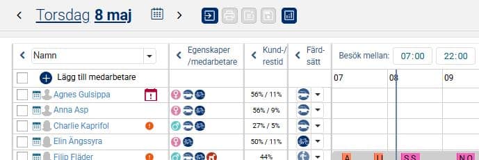 Till höger om egenskaperna finns en kolumn som visar kundtid respektive restid i procent per medarbetare för den aktuella dagen så att man kan få en snabb överblick. Detta beräknas utifrån det valda färdsättet som vi ser i nästa kolumn där det också går att ändra färdsätt.