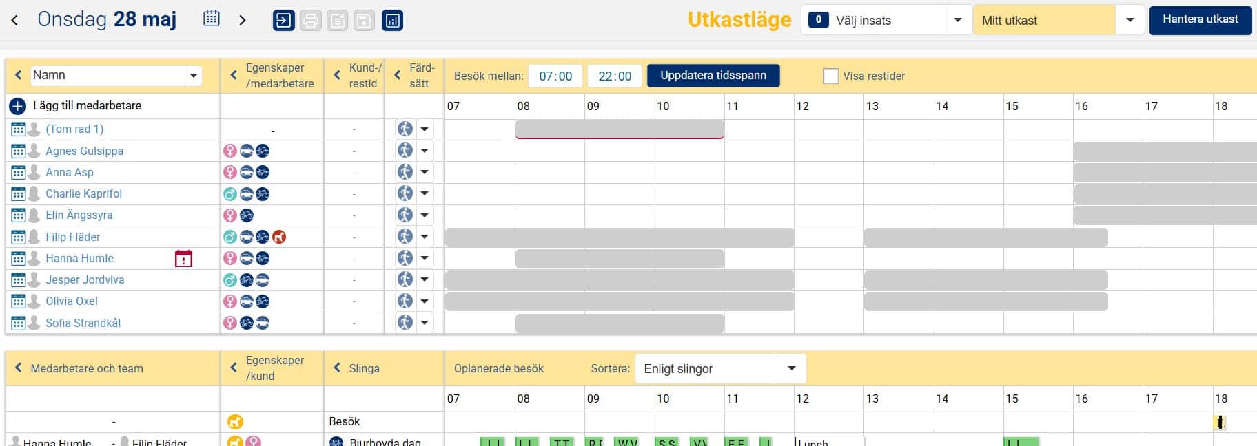 Vi kommer i denna artikel gå igenom vilken information som visas i denna vy, hur man på olika sätt kan planera en dag i Grafiska planeringen, hur man gör ändringar i en redan planerad dag samt hur tillägget utkast-funktionen fungerar.