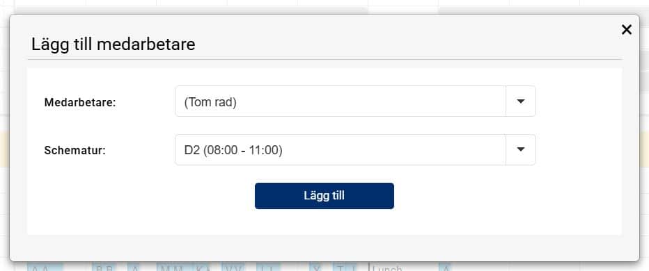 En annan ändring man kan göra i en redan planerad dag är att exempelvis lägga till en ny medarbetare. För att lägga till en ny medarbetare i planeringen för den aktuella dagen klickar man på knappen Lägg till medarbetare, väljer medarbetare i listan och vilken schematur medarbetaren ska ha. När man sedan sparar kommer en ny schemarad finnas i planeringen med den nya medarbetaren.
