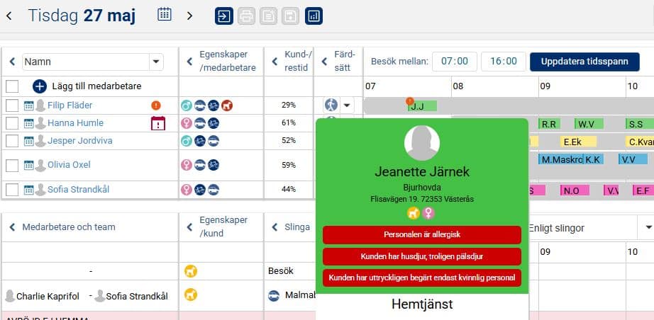I exemplet nedan ser vi att det finns flera konflikter i besöket hos kunden Jeanette Järnek som är planerat på medarbetaren Filip Fläder. Jeanette har husdjur, och Filip är allergisk. Samtidigt har Jeanette även uttryckt att hon endast vill ha kvinnlig personal och Filip är en man.