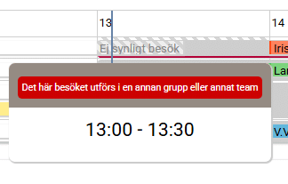 Om de medarbetare som arbetar aktuell dag även är schemalagd i en annan grupp samma dag visas detta upp genom att schemaraden för den medarbetaren blir streckad. Den information som visas för besöken som är planerade i den andra gruppen beror på vilken behörighet medarbetaren som arbetar i Grafiska planeringen har. Om medarbetaren inte har behörighet till den gruppen visas besöket upp med texten Ej synligt besök (se bilden nedan). Vi ser tidpunkt för besöket men ingen övrig information. Om medarbetaren har behörighet till den gruppen visas mer information om besöket, exempelvis namn på den kund som besöket tillhör.