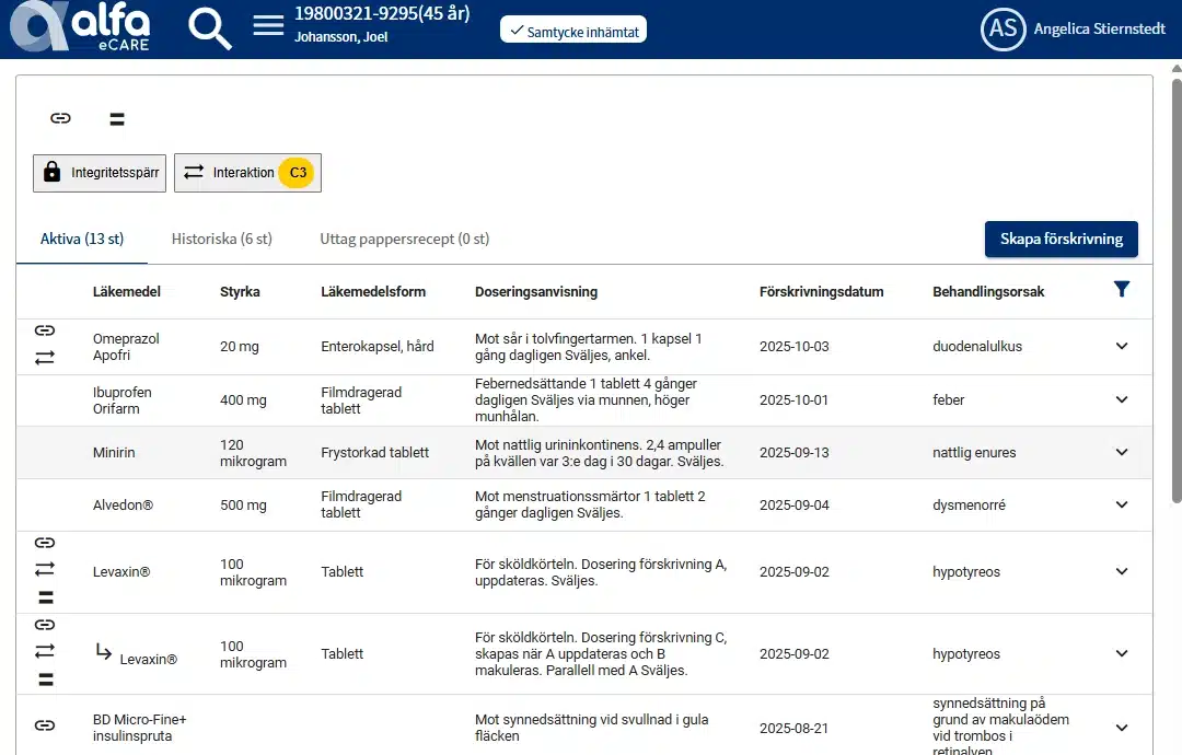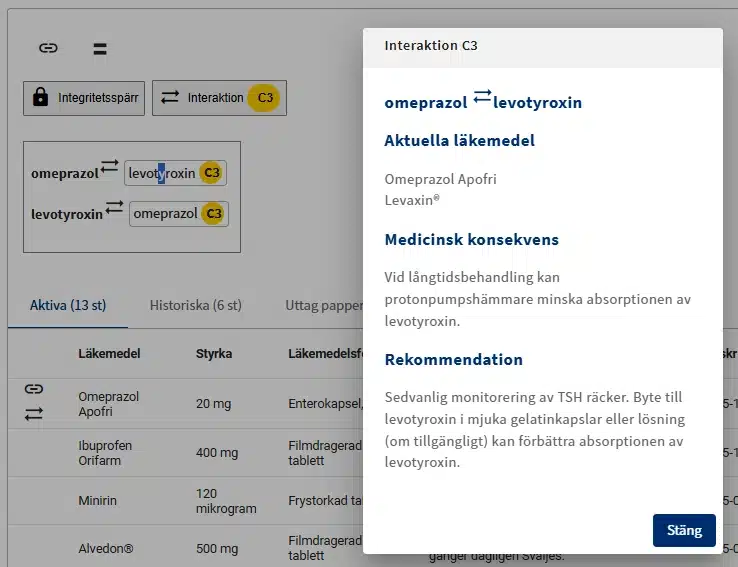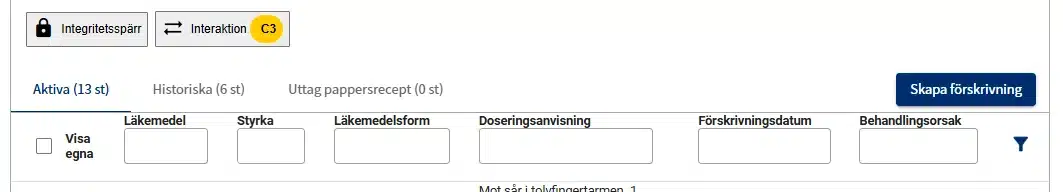 Längst upp på sidan finns funktionen Interaktioner, som består av en knapp för att visa vilka läkemedel som interagerar samt en varningsindikator.