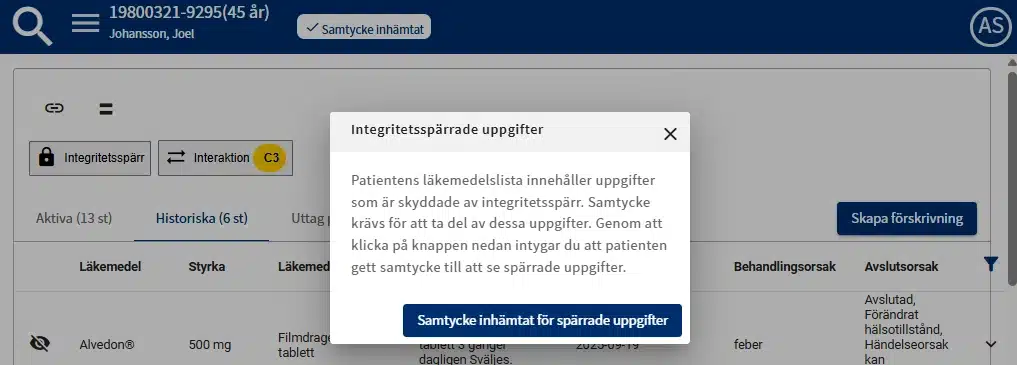 Samtycke krävs då för att ta del av dessa uppgifter. Genom att klicka på knappen och sedan “Samtycke inhämtat för spärrade uppgifter” så intygar du att patienten gett samtycke till att se spärrade uppgifter.