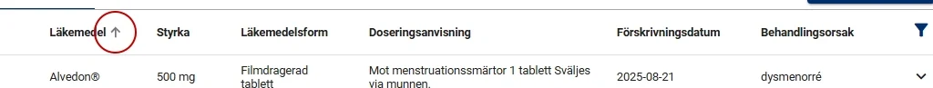 Listan av läkemedel är grundsorterad efter förskrivningsdatum. Genom att klicka på en kolumnrubrik så kan du sortera i stigande eller fallande ordning. Pil upp / ned bredvid en rubrik anger sorteringsordning.
