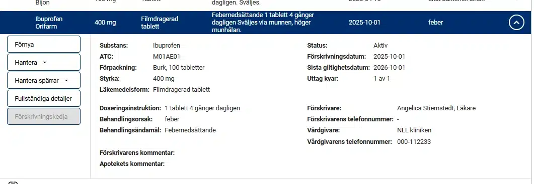Alla läkemedel och andra varor som förskrivs på patientens personnummer visas i patientens nationella läkemedelslista (NLL).