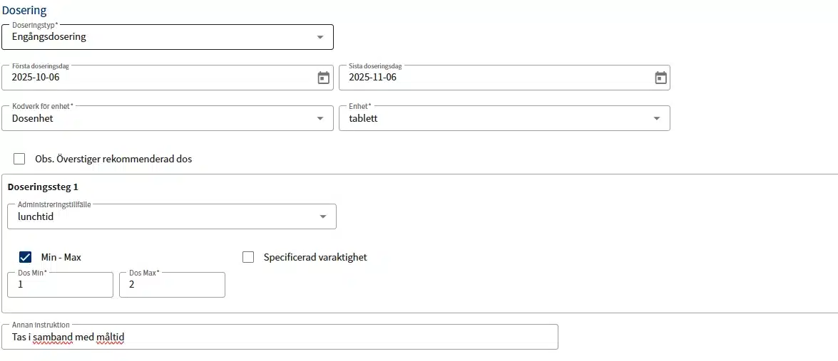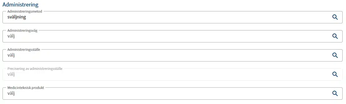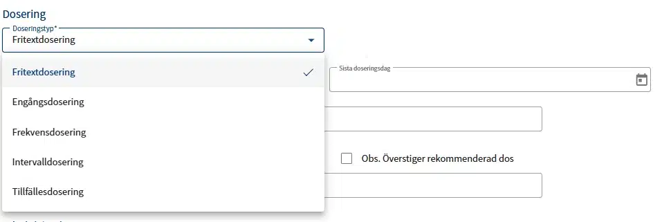 Doseringstyp är ett obligatoriskt fält med 5 olika val. Beroende på ditt val anpassas formuläret med vilka fält som ska fyllas i.