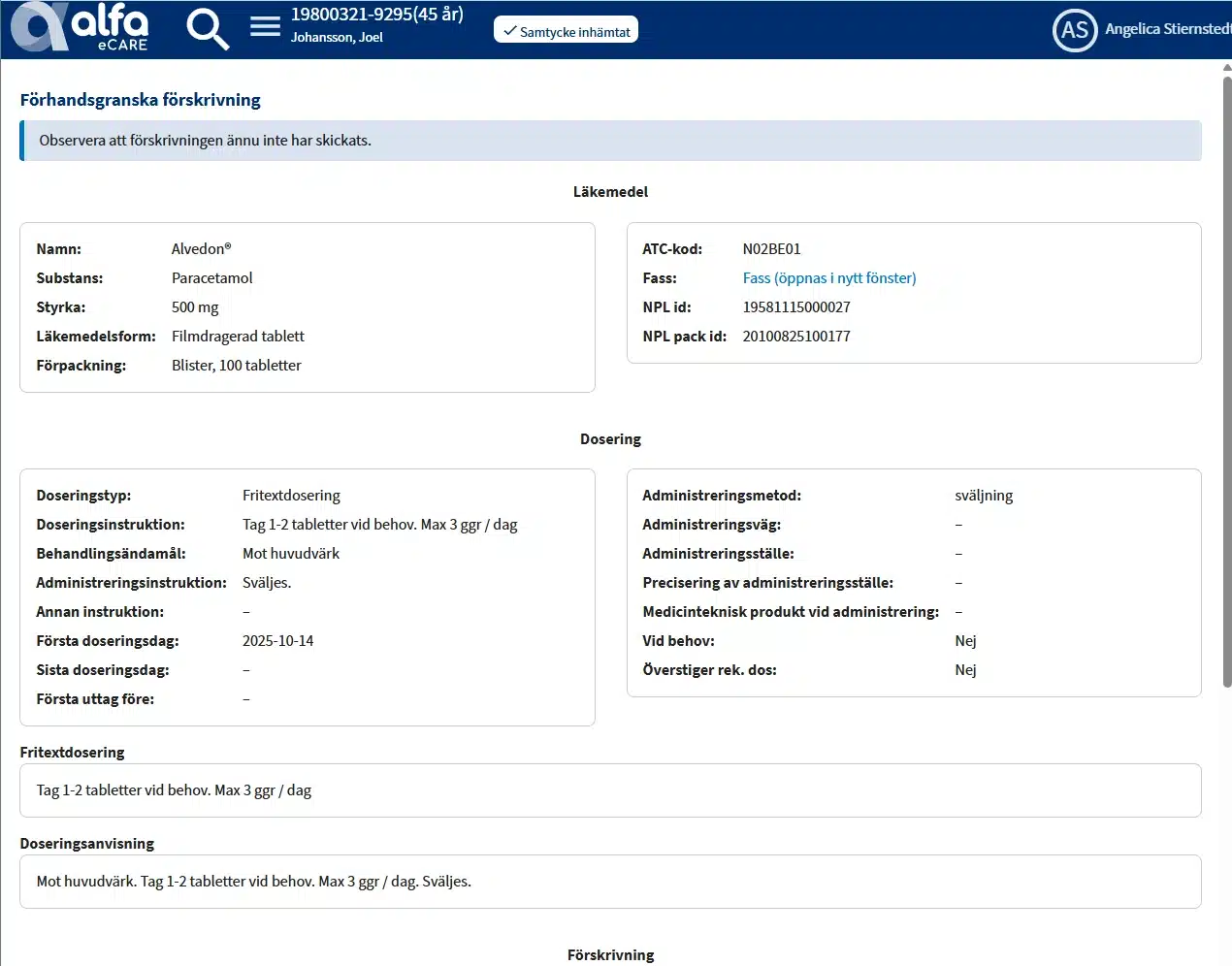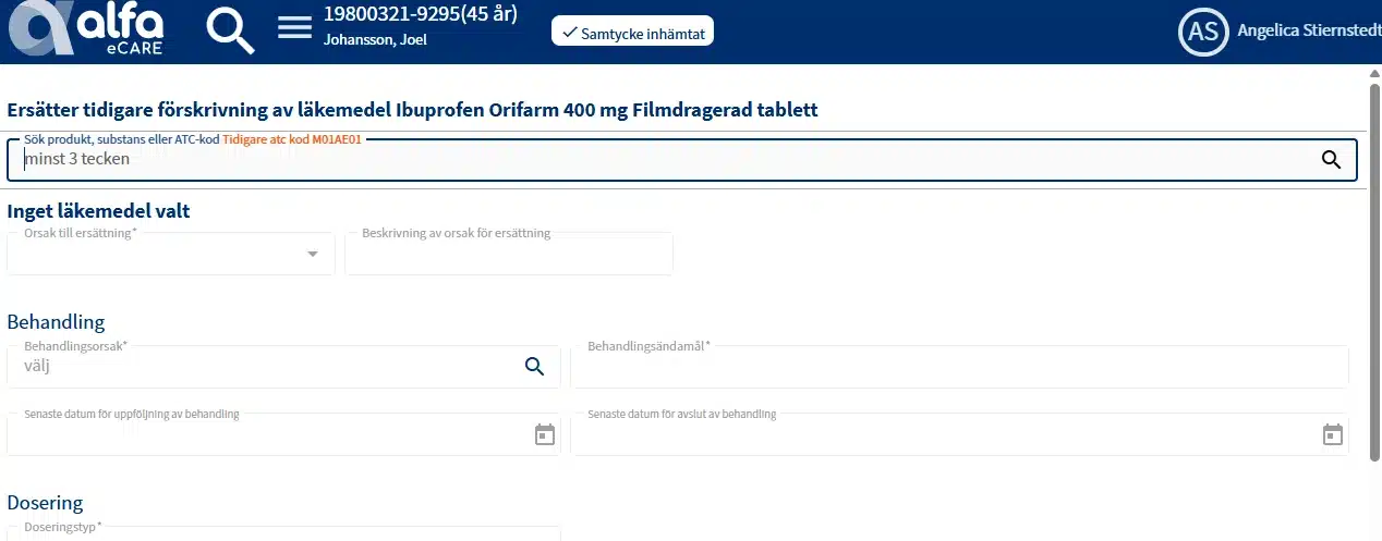 Efter ett nytt läkemedel är valt kommer systemet hämta in vissa uppgifter från den tidigare förskrivningen. Komplettera dessa och skapa sedan den nya förskrivningen.