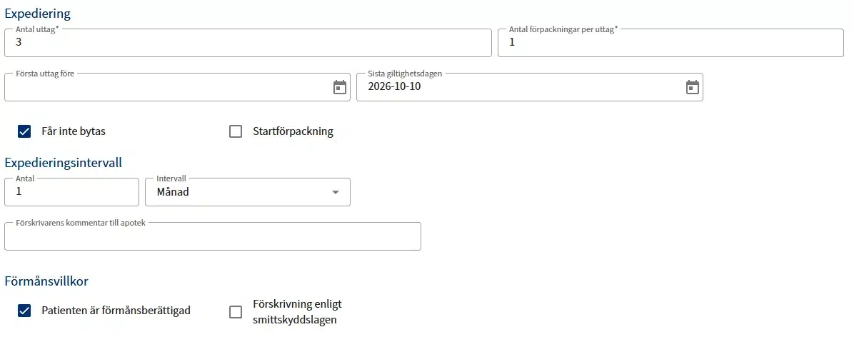 Markera om patienten är förmånsberättigad, och om läkemedlet du förskriver är kostnadsfritt enligt smittskyddslagen. Den som är bosatt i Sverige har rätt till förmånsberättigade läkemedel, det vill säga omfattas av högkostnadsskyddet. Även patienter som bor utanför Sverige kan omfattas av högkostnadsskyddet, men för dem gäller andra regler.