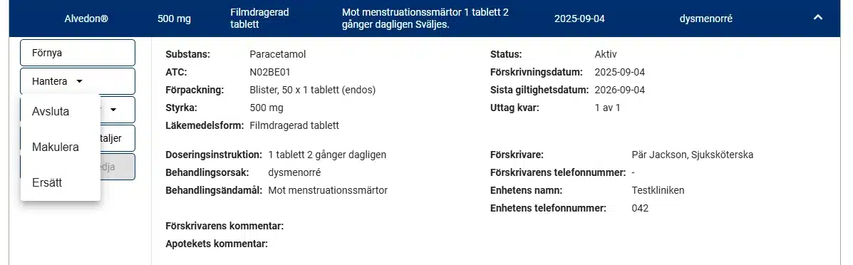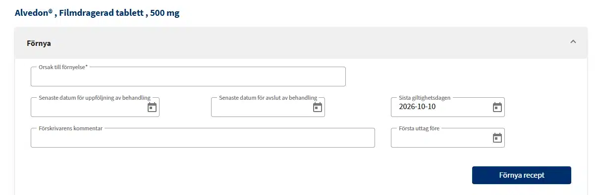 Det är möjligt att sätta Sista doseringsdag till dagens datum vilket innebär att patienten inte ska använda sitt läkemedel enligt denna förskrivning men en ny förskrivning kan skickas.
