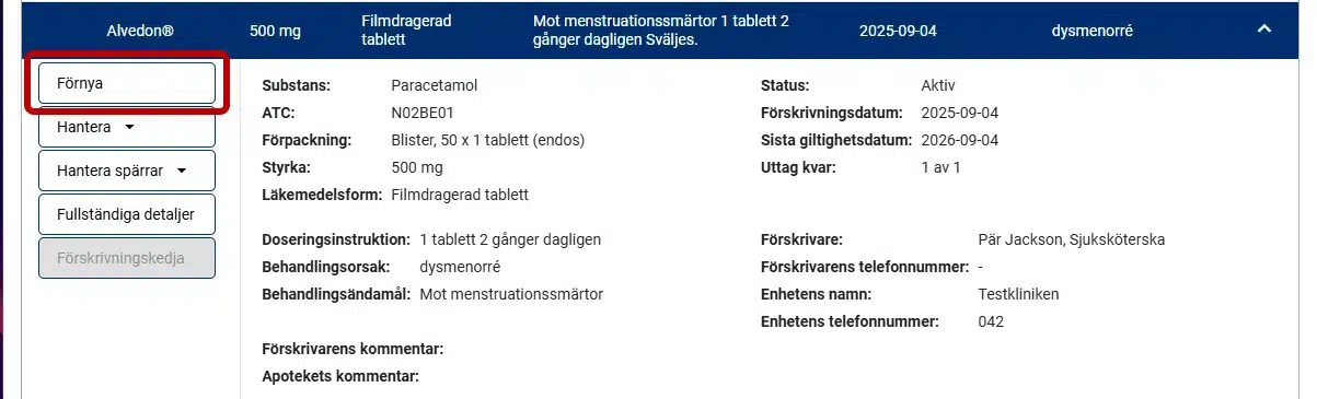 För att förnya ett recept klickar du på aktuell rad i tabellen. Klicka på Förnya knappen.