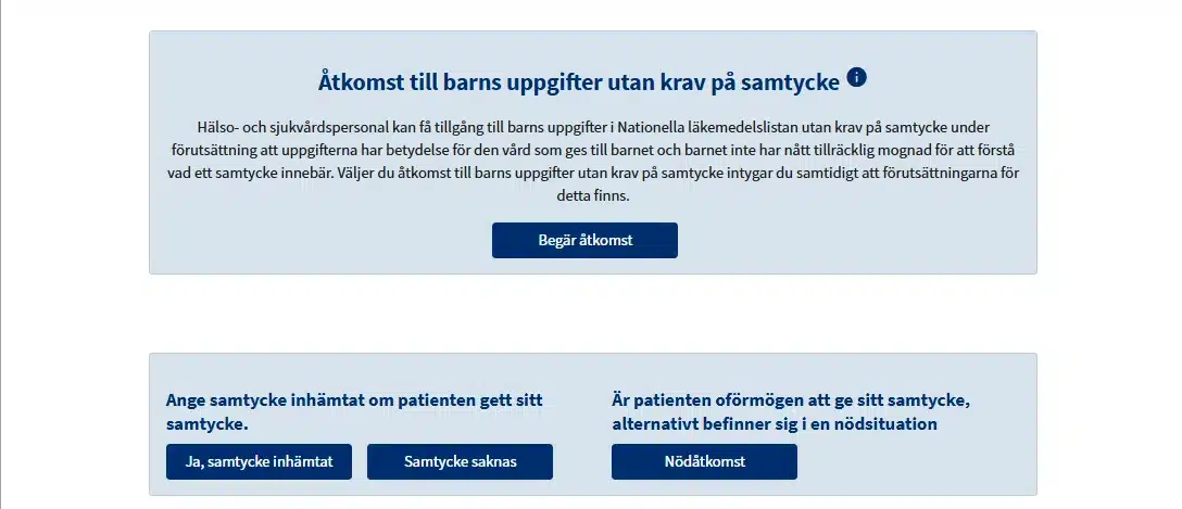 Grunden för denna bedömning ska framgå av patientens journal. Väljer du nödåtkomst intygar du att förutsättningarna för detta finns.