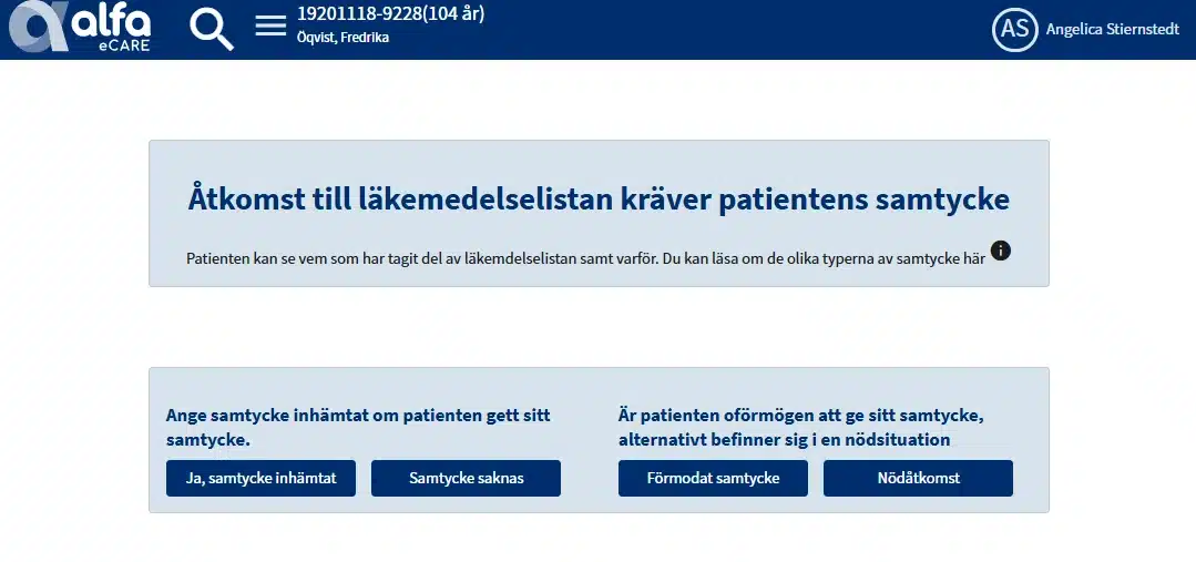 Hälso- och sjukvårdspersonal kan hänvisa till ett förmodat samtycke för att vid en vårdkontakt tillfälligt få tillgång till en patients läkemedelslista under förutsättning att patientens inställning så långt som möjligt har klarlagts och det inte finns anledning att tro att patienten skulle ha motsatt sig åtkomst. Dessa förutsättningar ska framgå av patientens journal. Väljer du ett förmodat samtycke intygar du att förutsättningarna för detta finns.